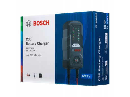 PROSTOWNIK C30, NAPIĘCIE ŁADOWANIA: 6/12 V BOSCH, PRĄD ŁADOWANIA: 0,8/3,8A, NAPIĘCIE ZASILANIA: 230V, RODZAJ AKUMULATORA: AGM/CA/CA/EFB/GEL/VRLA