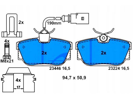 KLOCEK HAMULCOWY KPL. TYŁ (Z DODATKAMI, ZE ŚRUBAMI PROWADZĄCYMI ZACISKU HAMULCOWEGO), PASUJE DO: FORD GALAXY I, SEAT ALHAMBRA, VW SHARAN, TRANSPORTER T4 1.8-2.8 07.90-03.10