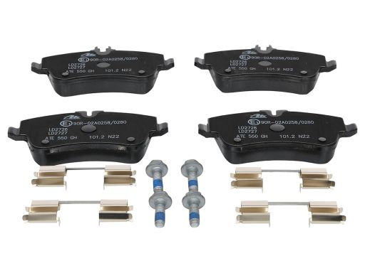 KLOCEK HAMULCOWY KPL. CERAMICZNY PRZÓD (Z DODATKAMI, ZE ŚRUBAMI PROWADZĄCYMI ZACISKU HAMULCOWEGO), PASUJE DO: MERCEDES C (CL203), C T-MODEL (S203), C (W203), CLC (CL203) 1.6-2.2D 05.00-06.11