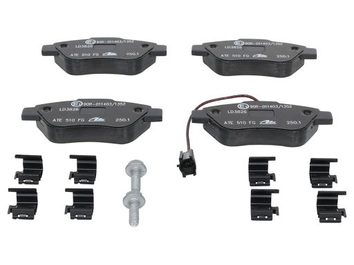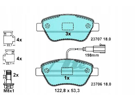 KLOCEK HAMULCOWY KPL. CERAMICZNY PRZÓD (Z DODATKAMI, ZE ŚRUBAMI PROWADZĄCYMI ZACISKU HAMULCOWEGO), PASUJE DO: ALFA ROMEO MITO, FIAT 500, 500 C, FIORINO, FIORINO/MINIVAN 0.9-ELECTRIC 10.04-