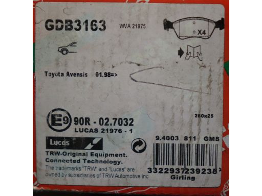 KLOCEK HAMULCOWY KPL. PRZÓD , PASUJE DO: TOYOTA AVENSIS 1.6-2.0D 09.97-02.03