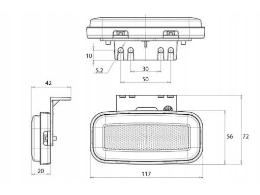 ŚWIATŁO OBRYSOWE L/P, POMARAŃCZOWY, LED, WYS. 56MM, SZER. 117MM, GŁ. 20MM, PODWIESZANA, DŁUGOŚĆ PRZEWODU 220MM, Z WIESZAKIEM, 12/24V (RODZAJ: NEON)